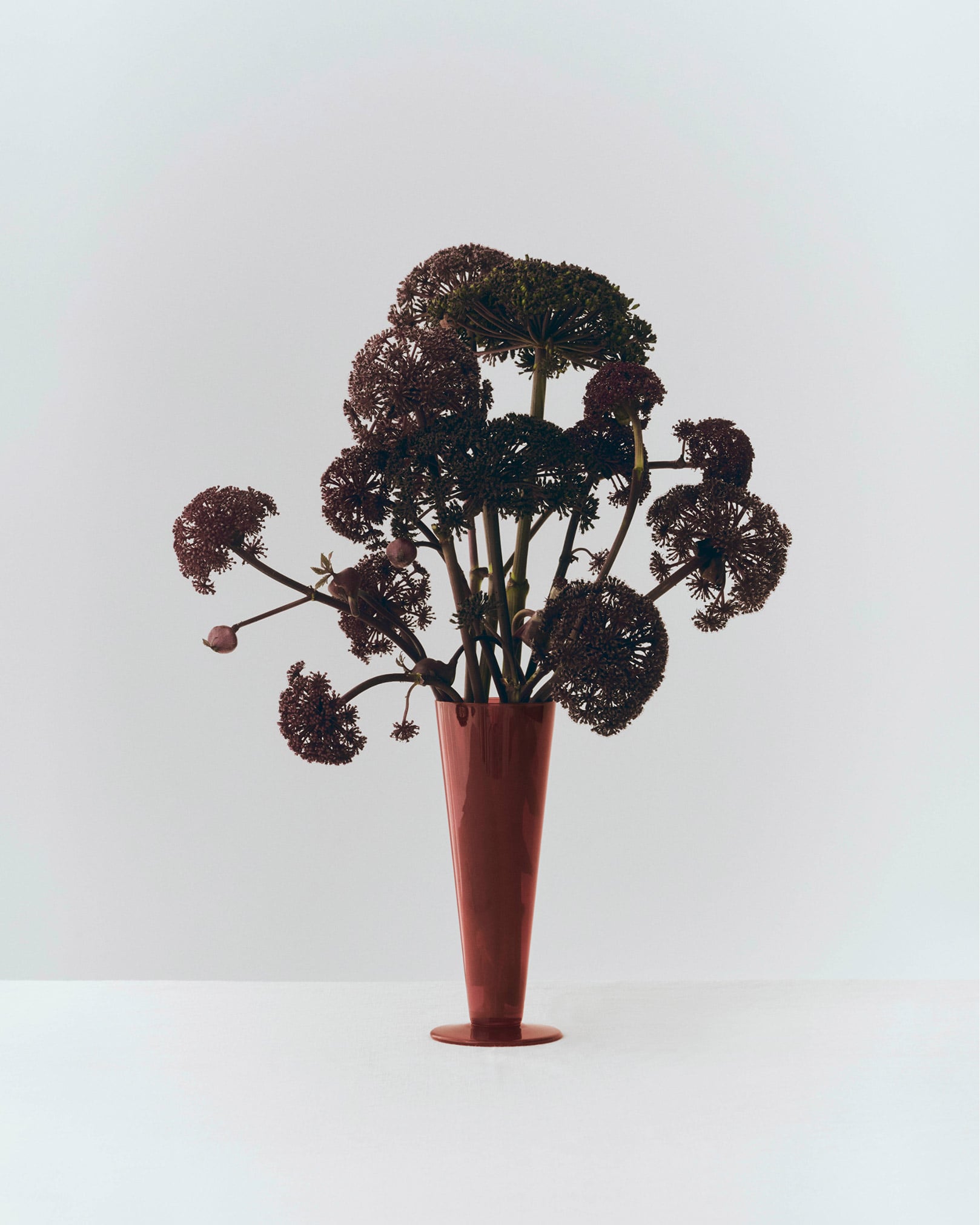 エッジの効いた直線的なシルエットが目を引く「Conical Vase(コニカルベース)」。ソーダライムガラスで作られ、手描きのストライプデザインが施されています。 サイズやカラーのバリエーションも豊富で、一輪挿しや摘んできたばかりの野草、シンプルなフラワーアレンジメントなど、どんな花も美しく引き立てます。置くだけで空間にモダンなアクセントを添えてくれるアイテムです。