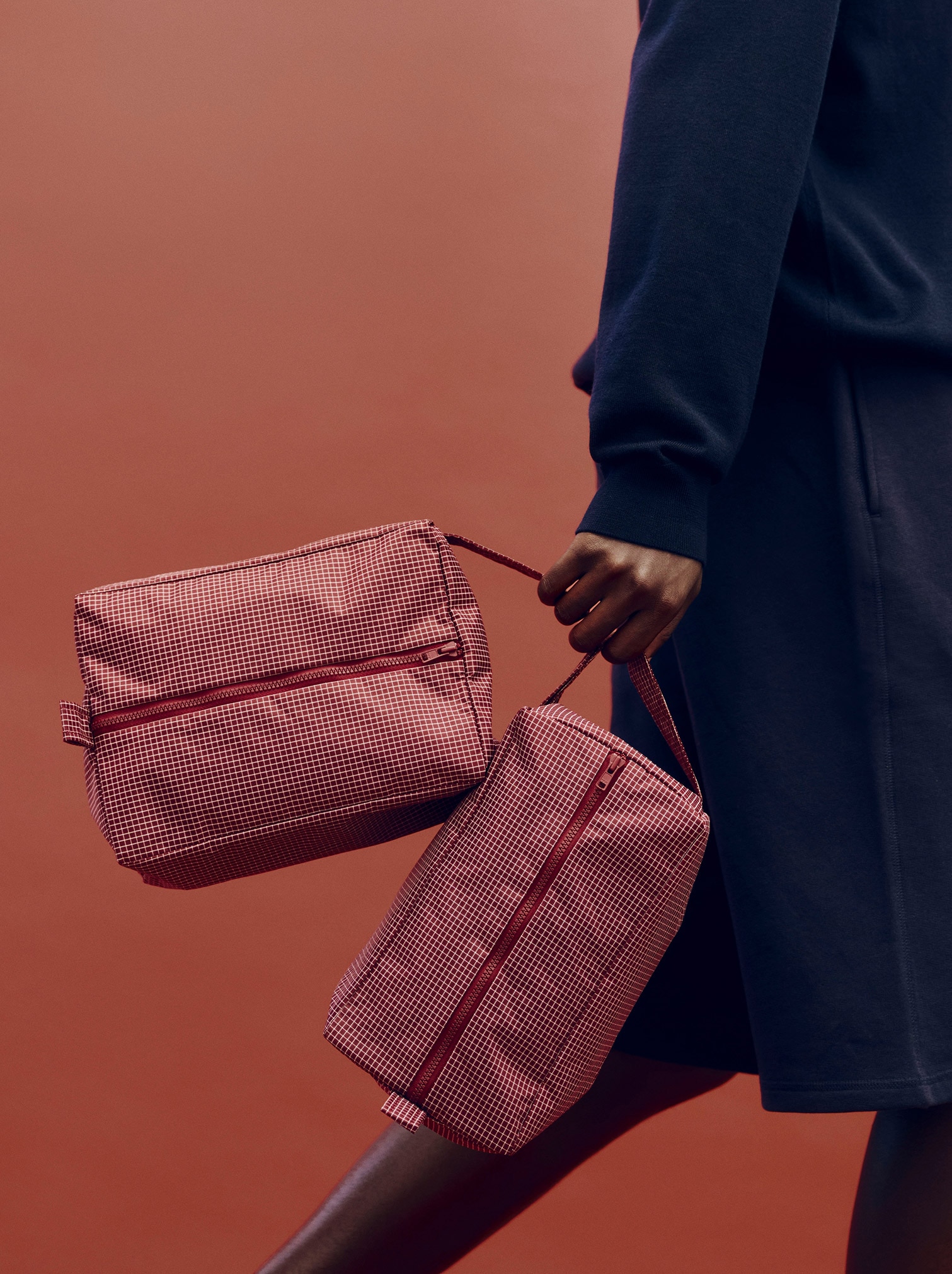 シンプルなデザインと実用性を兼ね備えた「Grid Wash Bag」。毎日の必需品をスマートに整理して持ち運べるウォッシュバッグです。 素材には、撥水加工を施したリサイクルナイロンとリサイクルポリエステルの耐久性に優れた混紡生地を採用。さりげないチェック柄がアクセントになっており、開閉しやすいジップ仕様と、持ち運びに便利なハンドル付き。 メイク道具やアメニティグッズなどがたっぷり入るサイズ感で、旅行先でもご自宅でも、中身を濡らさず清潔に保ちます。2種類のデザインと豊富なカラーバリエーションから、お好みに合わせてお選びいただけます。